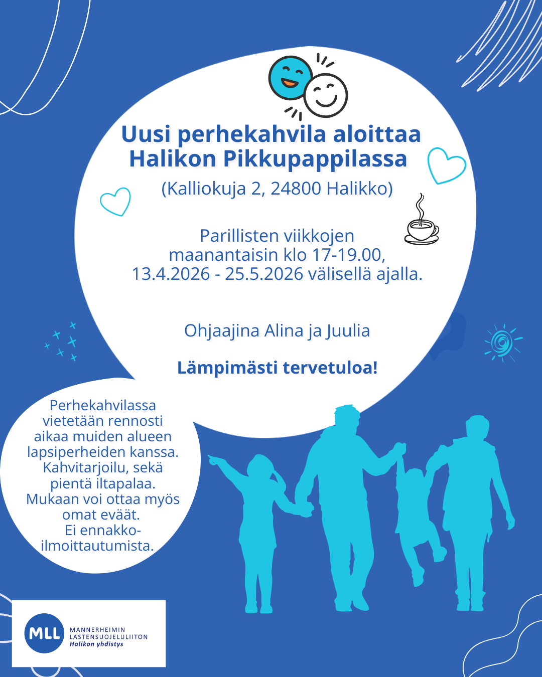 Yhdistyksemme kaipaa innokkaita uusia perhekahvilaohjaajia. Lue täältä kuvaus perhekahvilaohjaajan tehtävistä. Ilmoittaudu vapaaehtoiseksi sivuilta löytävän linkin kautta tai laita sähköpostia meille osoitteeseen mll.halikko@gmail.com