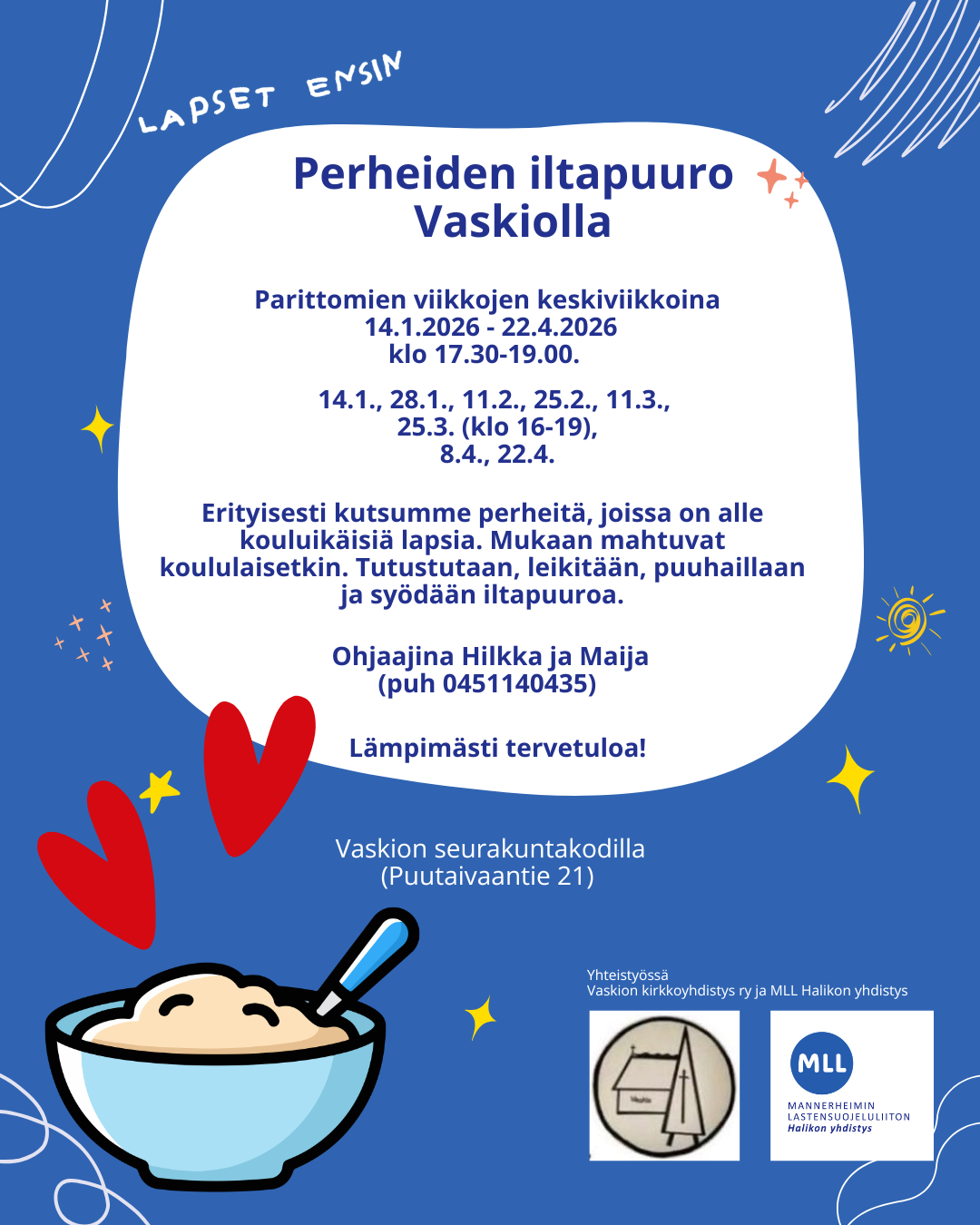 Perheiden iltapuuro -perhekahvila kokoontuu parittomina keskiviikkoina: