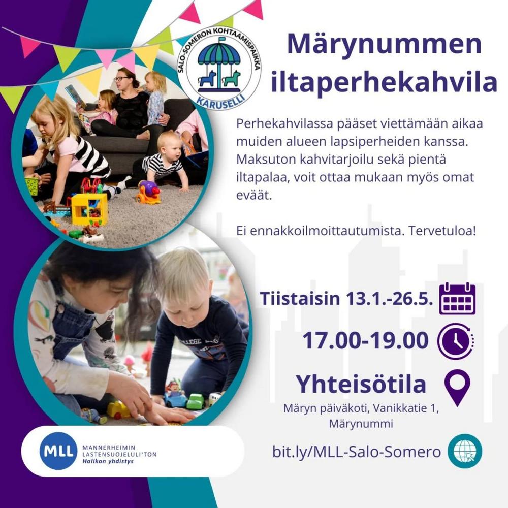 ILTAPERHEKAHVILA MÄRYNUMMEN AVOIMELLA PÄIVÄKODILLA, Vanikkatie 1, 25250 Märynummi: 13.1.2026-26.5.2026, tiistaisin klo 17-19.